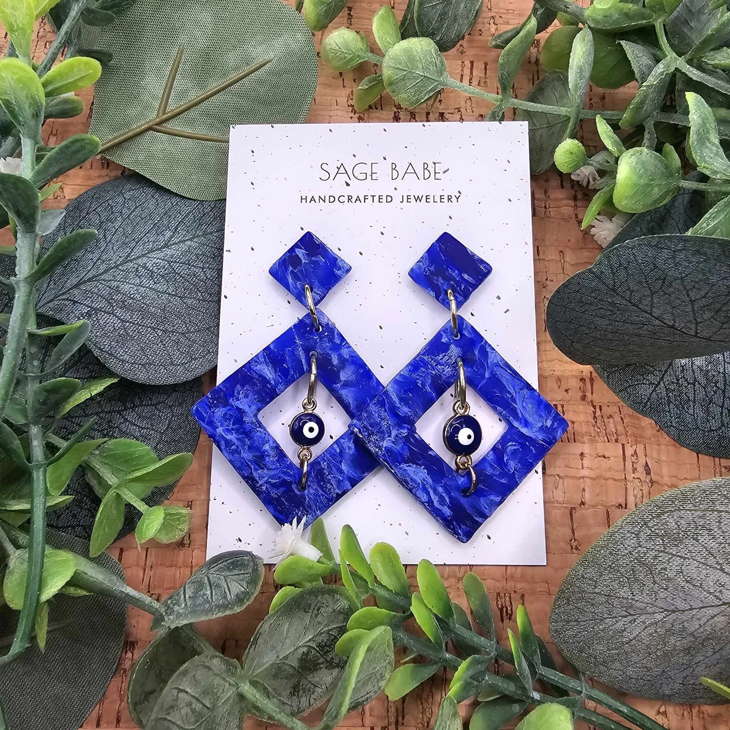 Large diamond shaped dangles with an evil eye charm in the center. Bright blue clay with white marbling and gold tone hardware.